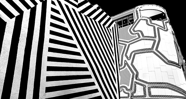 Great use of perspective to create one graphic. Without the windows at top, I could never have guessed that these were buildings. I wonder if a darker grey or black to replace the sky would give more impact? (I cold not tell for sure if the round space at top was part of the building or open to the sky.) |