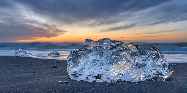 I like your viewpoint. By increasing the exposure in the ice, you probably made the sparkle show off more, helping draw us to the ice. The added benefit you seemed to have gotten with the longer exposure is the water has a more silky look. Even your immediate background compliments this (the more distant ice). Having that sky is just a bonus. Good job.