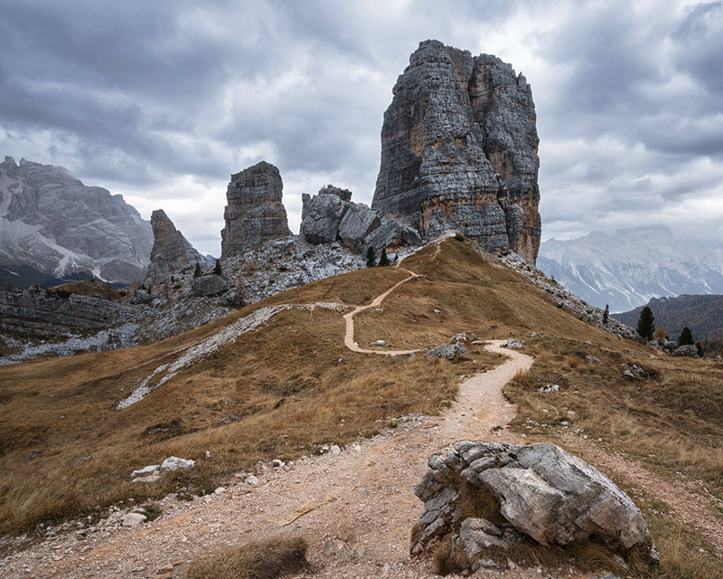 Normally I am in favor of foreground material like these rocks to add dimension to a landscape. In this case, if you could have stepped slightly to the left, the rocks would have been to the side of the path. But now they act as a blocker to the wonderful leading line you have. I would suggest using a content aware scale on the rocks, and moving them to the right, and then clone or fill the original rocks with path material. I tried that, along with a very slight increase in contrast, and adding a little more "drama" to the sky.I also toned down the brighter edge of the foreground rocks. See what you think. |