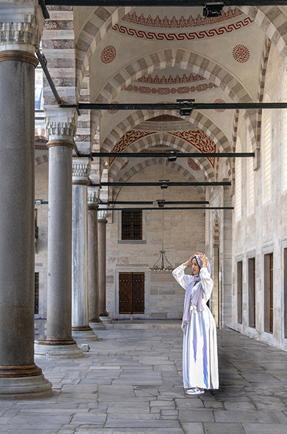 I like the approach of a vertical pano, as we do not see them very often. The modern light brackets do get in the way somewhat, and I wonder if cropping would help to de-emphasize their effect? Since I tried that to see how it looked, I also darkened the lighter edge of the front column to keep the eye focused inward.