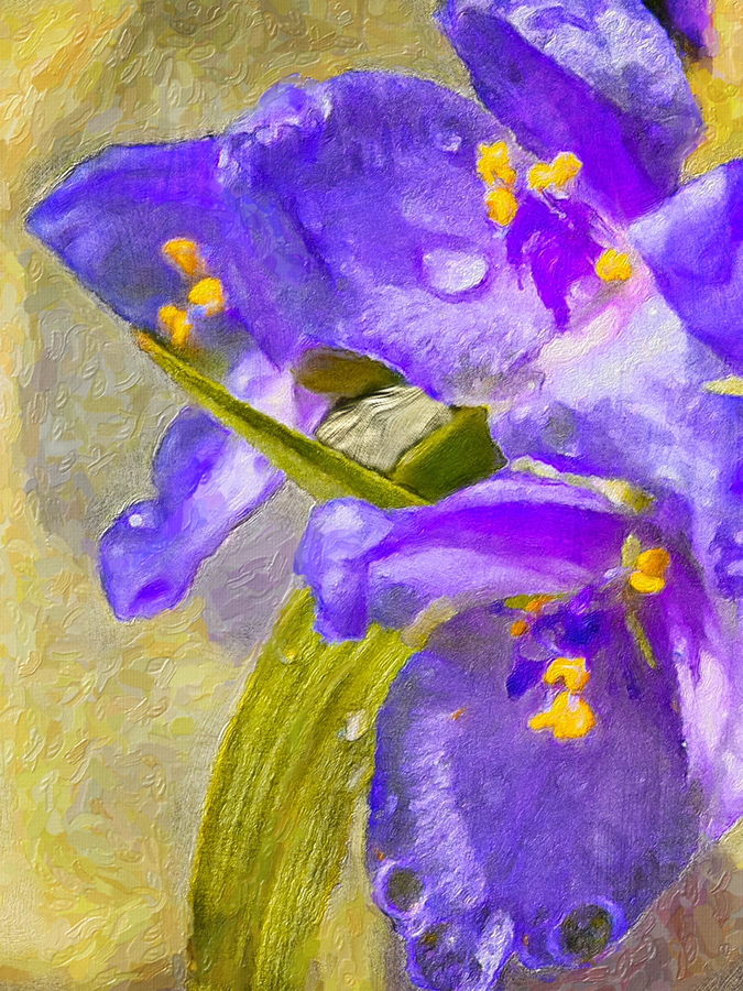 I like that the techniques took a very contrasty image and turned into something more subtle and etherial. I like turning some images into paintings, and although Photoshop still has the painting brushes, several fun programs like Topaz had are no longer supported. There is one that I have that will probably stop working with the latest update to the MAC system, and that is Snap Art by Alien Seed. I tried it here as a mask on the background to add some heavy brush strokes. I also noticed that the dark area in the center of the flower was originally part of the background, so I cloned it back to the background. (It did not seem to fit on the flower otherwise.) |