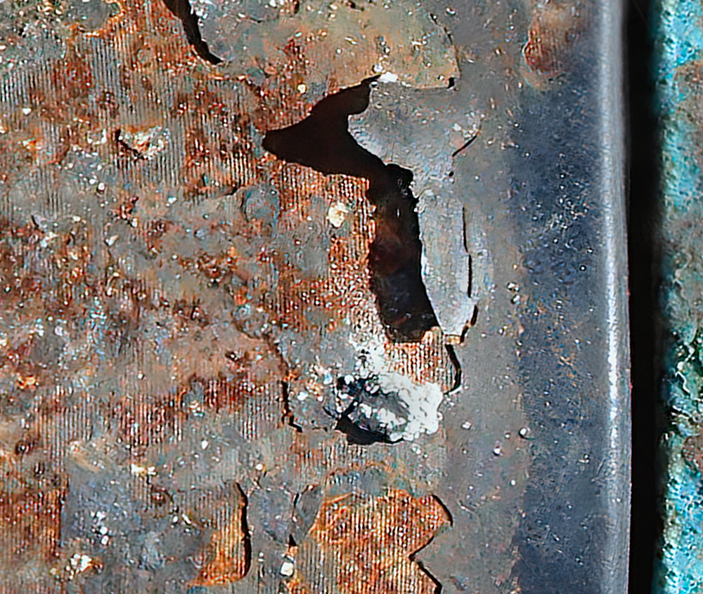 Cool photo, rust and peel are always fun subjects, full of fun textures. What jumped out at me when I first looked at your photo was the dog shadow. So I went with that in my crop. To get the shadow right I had to rotate the image and clone in where it was blank. |