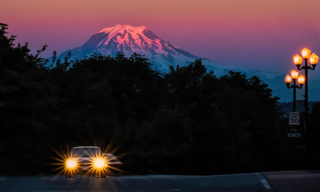 It's just me but the everyday feel of your photo with the cars facing away from the mountain says that even a grand vista like Mt. Rainer at sunset can become a common and overlooked event. |