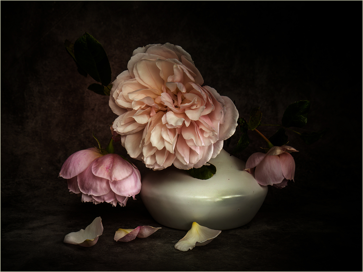 Welcome to the group Judith. There are two genres which I have not explored as yet in my photographic journey- still life and "creative" or "augmented reality" as it is referred to these days. My PS skills are rudimentary at best. I so admire the image you have posted. Very neat and such a creative use of props. The PS work is spot on. I wondered if a darkened background would enhance the flowers and enhance play of light? I tried that. Not sure if it destroyed the image? Burned the bright spot on the right side of the pot to reduce the attention seeking spot of light. |