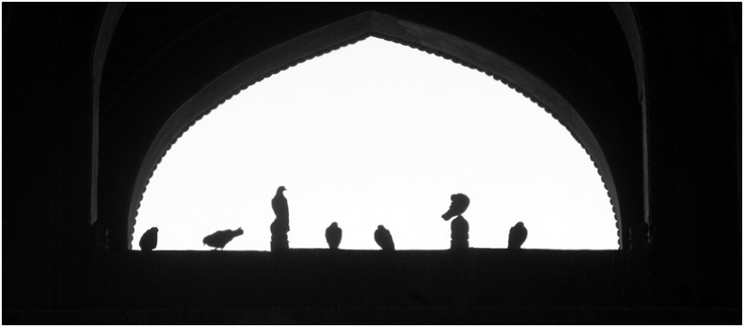 I had to peer very closely to see the double frieze in the black area. I think I would have preferred more easily see-able detail because initially all I saw were the silhouettes in the archway and a huge black area all around. For me, the crop would have been a letterbox shape, just to show the arch and emphasise the birds. |