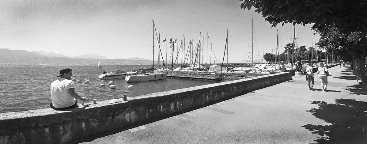 OK, you are probably going to hate what I've done, but I felt this needed some changes! First of all, it may be an optical illusion but the horizon seemed to tilt the water down to the right, so I straightened it up a little. Then I cropped off a lot of the blank sky and some of the boring pavement so it became a letterbox shape -do Americans know what that means since you don't seem to have them in your front doors? Then I decided that I doidn't like the gap between the two figures and the only way to deal with that was to take out the central one as the other guy did provide a lead-in. I found the cars and stalls on the right of the trees rather distracting so they had to go and the trees further away didn't have the gaps between them so they still provided a sense of perspective. Then I darkened the sky at the corners and some of the pavement and finally using curves I increased the contrast. None of that was easy, especially the cloning part, as it is such a small image to work on, but I did feel that I had kept the dynanics of the picture. What do you think? |