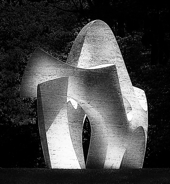 I agree that it is much better in mono. In the colour version, the green grass and foliage is far too dominant and draws the eye away from the sculpture. The light and shade on it are very pleasing. You'll soon find out that I like playing with images and I especially like Nik software for my mono ones. So, here's another version of your picture. I darkened the background and the grass because they seemed to be too obvious still in Ps and then I used Nik silver efex -push processes to make the sculpture stand out as a glowing edifice against the dark background. It's not so easy when its such a small low res picture and I'm working from your revised one, but what do you think? |