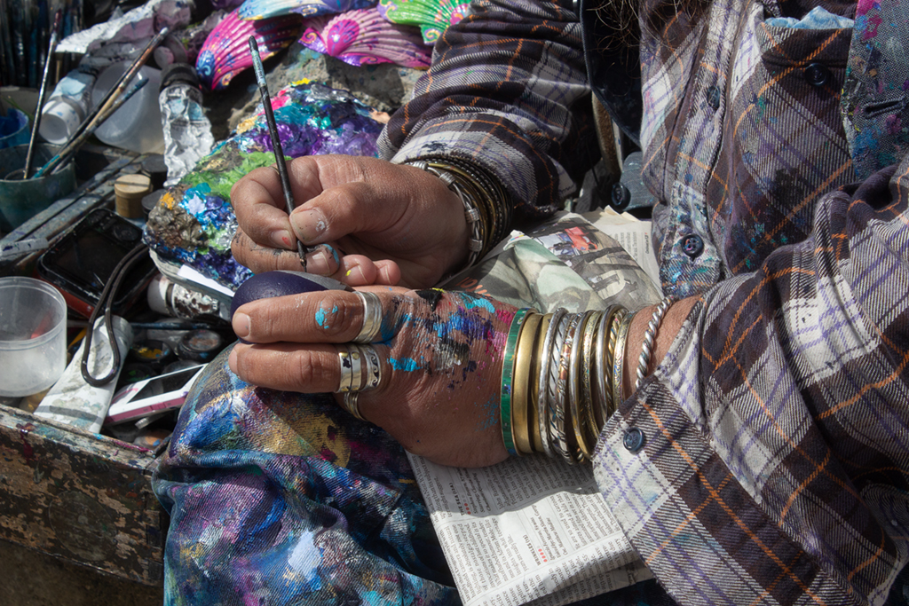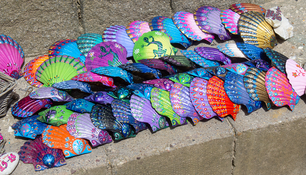 I have also been to Lulworth and Chris the shell man is always there! In fact I have photos of him which I have used in PJ competitions. When you take a photo of him, he also takes one of you. I attach the hands I've used and also one of the shells that he paints. They are 5 or 6 pounds each.
