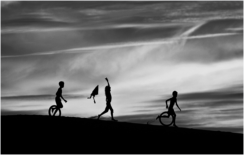 I agree with Tom that I like the main picture rather than the originals. however I felt there was too much of the hill at the bottom especially without a white defining line so I put one in as Stephen suggested -2 px only. However i also tried cropping in different ways. I took off some of the bottom, then a bit off the left to put the girl exactly in the middle but then I cropped more from the left to make the children look more as if they were running into and through and out the right side . This is the one I am showing here but I also liked the one I did with her in the middle but with less on the bottom because it made them look higher up. I increased the contrast using curves -pulling down the darker cloud tones but keeping the rest the same. |