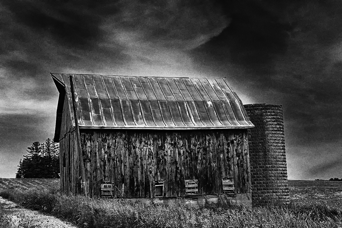 I don't think it is overdone at all. In fact, you should know by now that I would go even further with the contrast to get the black much darker especially on the sky. The overall image looks a bit grey to me. I did have a go, putting the original into silver efex wet rocks. I used control points to increase the sky contrast and then reduced the effect on the side of the barn. I tried reducing the grain in the sky but it still looks too grainy to me.