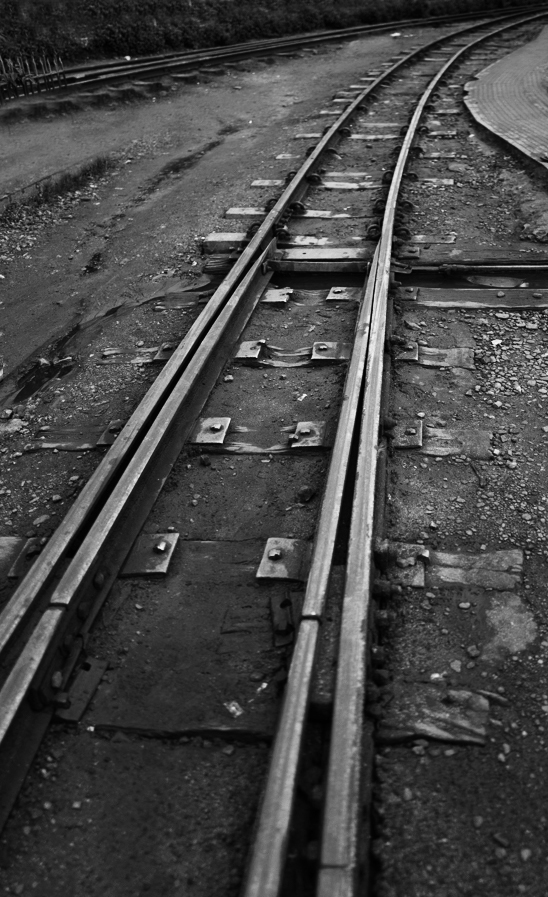 I like the curve of the rails, but I wondered whether you needed a little more included at the top end to enhance the perspective, so the two lines virtually touch at the top right corner. You might have to clone out the edge of the pavement. I did find the left top corner a bit empty and I don't know what you could do. I went back to your original and cropped it slightly differently. I cloned out the bit of blue and white railing top left and the vertical railings and then converted to mono plus an increase in contrast. is it better with the strong perspective enhanced? |