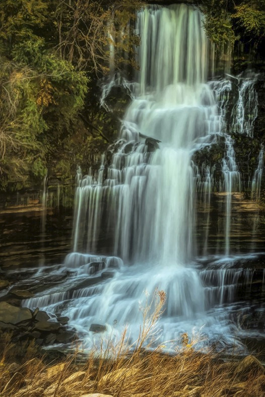 A very nice photo of a waterfall with good color and saturation in the editing process. The texture of the waterfall is excellent. Enhancement of the foreground weeds is of great benefit taking you into the photo. I might brighten the surrounding foliage a bit, which I don't think will take away from the waterfall and to straighten the overall photo a bit more. Thank you for the photo. |