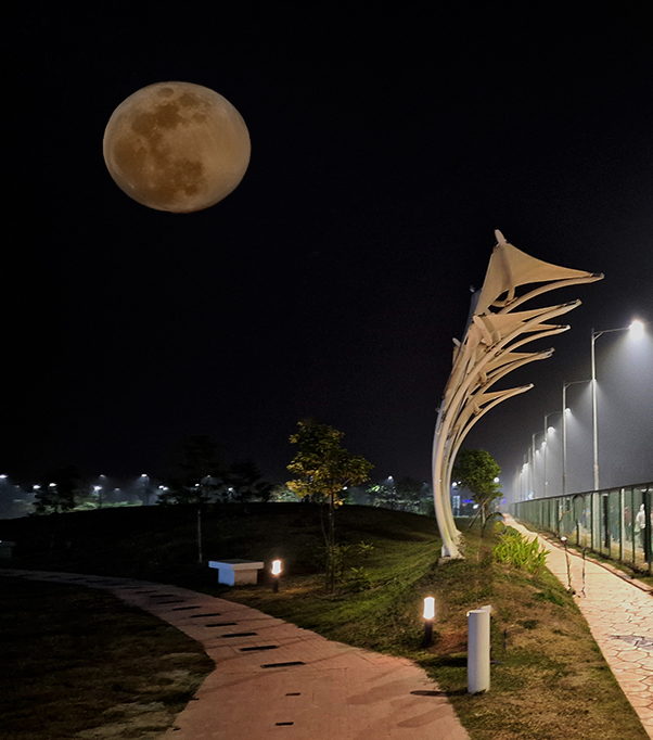 Except for the oversized moon, I would not have suspected this was a composite. I like the way the moon and the sculpture have similar colors, which makes the composition work cohesively. I agree about the pole to the right of the moon, so I would remove it. The other suggestion I would make is to crop the image just to the left of the last light pole. The composition is more focused on the relationship between the moon, the path and the sculpture. the misty lights are a nice finish on the right hand side. I find night photography very difficult and you have done a great job, especially considering the images you combined are hand held with a phone. Nice work! |