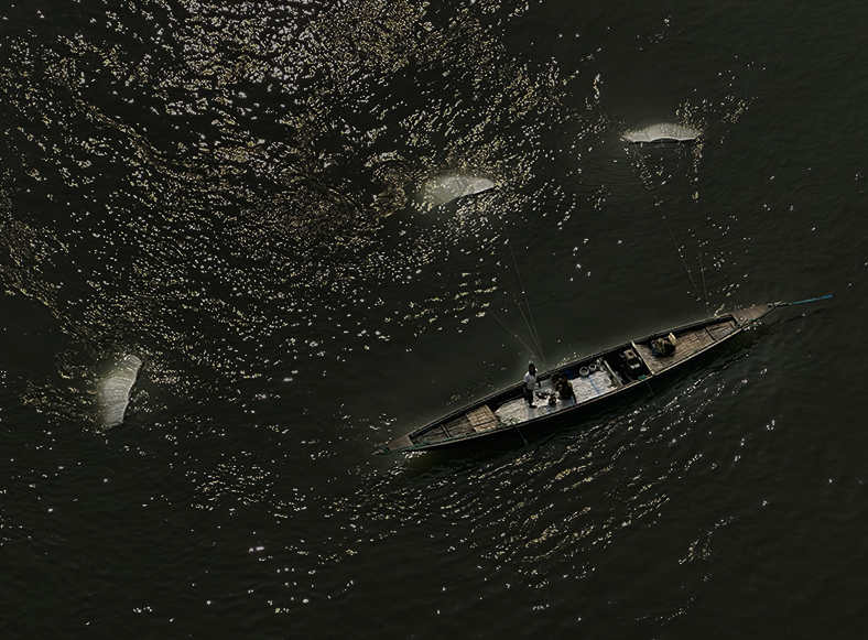 Hi Kamal. Once again, you've captured a unique aerial perspective of unique scene. I like the composition and the position of the boat and the nets is excellent. The bright sun reflections are bit distracting, but impossible to avoid. I tried to roughly reduce their brightness using a mask and camera raw and have attached the result, which may or may not be an improvement. (PS - I really like your new profile picture on FB!) |