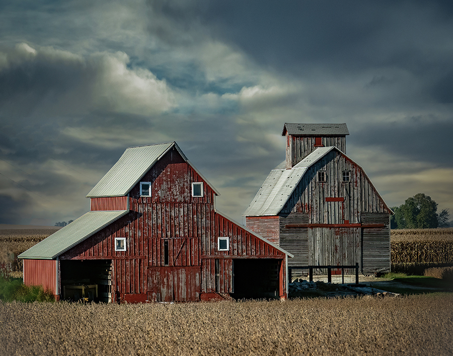 Thanks for your comments, Greg. I see what you mean about the horizon in the middle. I didn't want to crop, because I need to keep the aspect ratio for my calendar. However, I played with the composition using the distort tool to bring the barns lower in the frame and then the content aware fill tool to add sky in the middle. I'd appreciate your thoughts on the end result. |