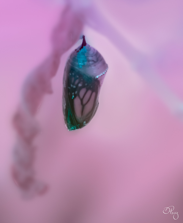 Reading the comments thus far, I have tinkered with the photo a bit more. The visibility of the butterfly only comes out in the IR, with the hot mirror the chrysalis is nearly opaque! Have tried sharpening a bit more, dampened the background and recropped. |
