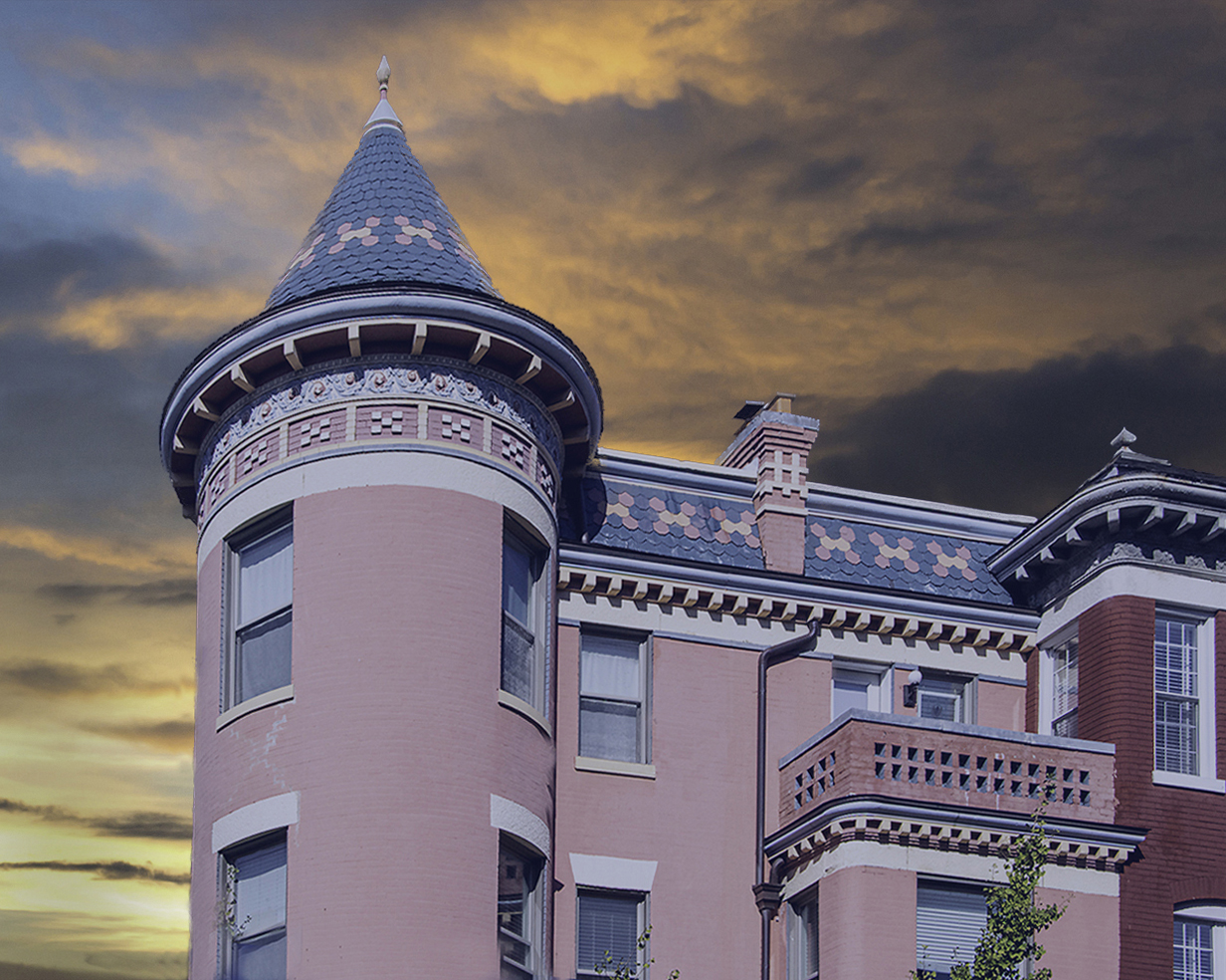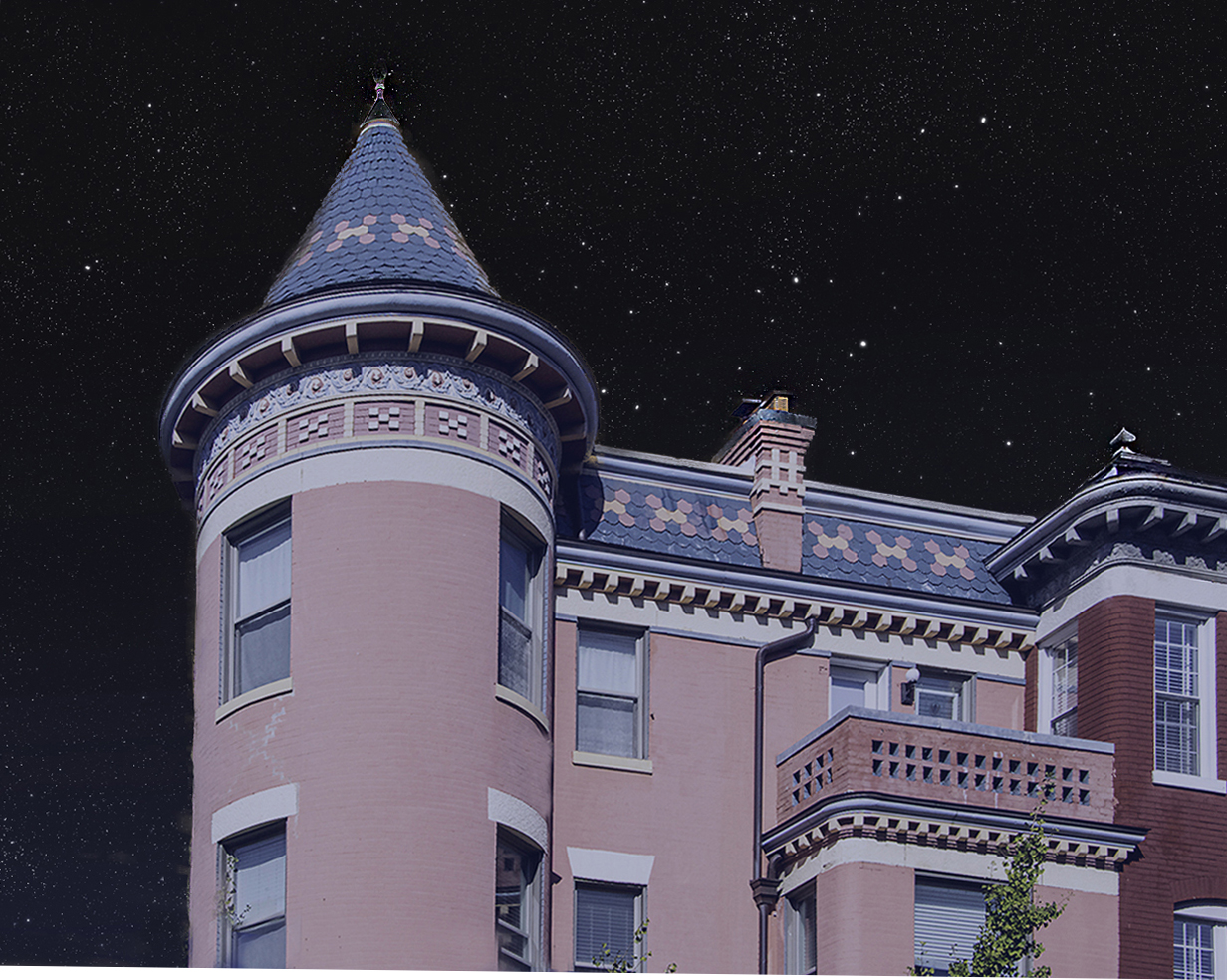 Dear Margaret, Please do not shoot the Photoshoper. I also love Victorian homes with conical roofs / pepperpot or pepperbox turret. (Had to google that!!!). The lower part of the cone bothered me somewhat so I also went into transform and pushed and pulled. Maybe a little better? My wife thought I got a little crazy with the backgrounds but l like them. The dark sky makes it look almost mystical. |