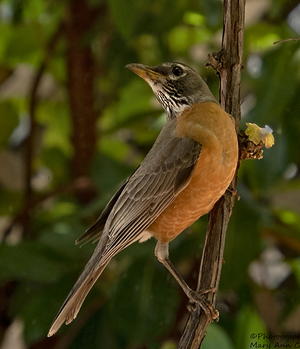 Hi Mary Ann, Like your robin image. The twist of the head and they way it is holding onto the tree makes it even more interesting. Great sharp exposure even through a window. Just my two cent but I don't think you need the branches on either side. Well done. |