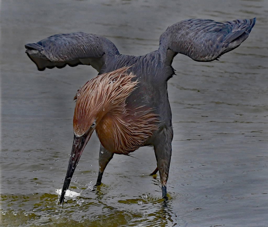 Good morning Isaac, Don and Leslie. The lighter reddish egret does not look realistic. This image was shot at 7:45am and he was soaking wet from fishing and diving (Very dark). The original at the top is probably the most true to color. Checked out about 40 other images of this bird shot at the same time and they were all dark. Fort DeSoto is an amazing place. Migration times are the best but there is a variety that I think live there year round. We have never been disappointed! Isaac, you are right these reddish egrets really put on a show and they don't seem afraid of man at all. |
