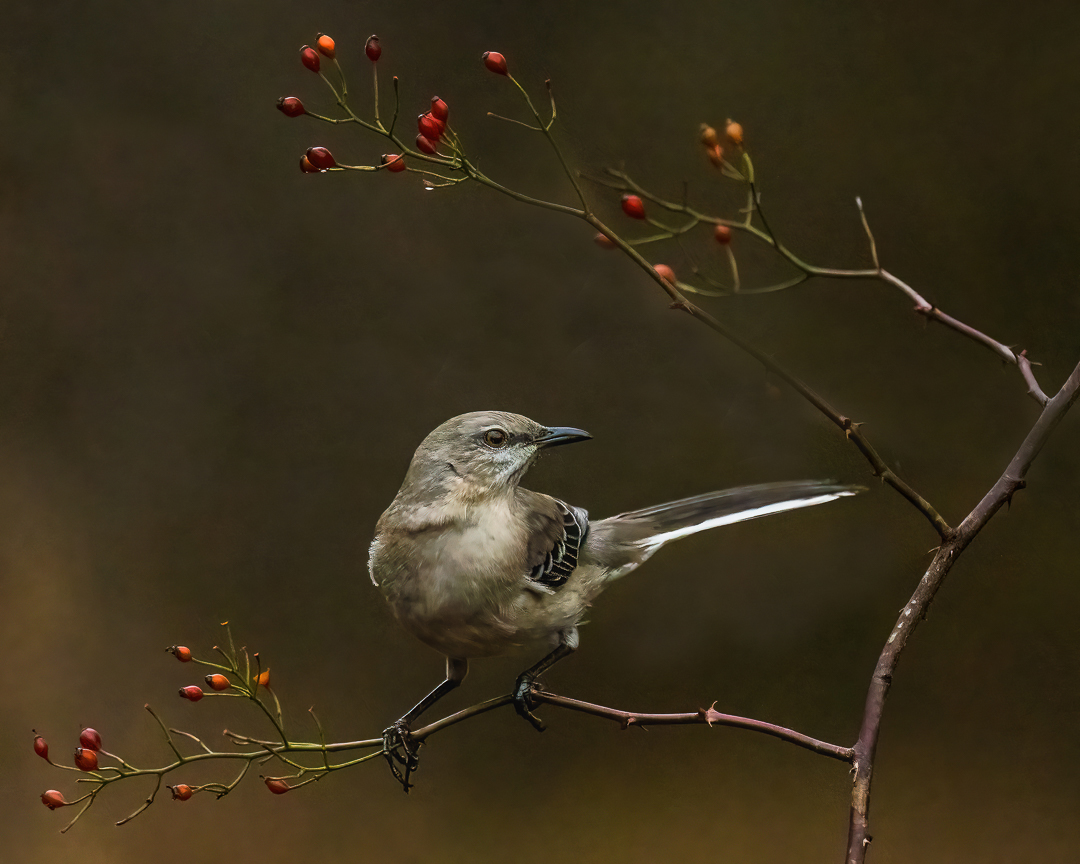 Xiao, love this image. Sharpness of the Mockingbird, turn of the head and layout in the branches are super. The only thing that bothered me were the light stripes near and above the bird. Edited a little. What do you think? |