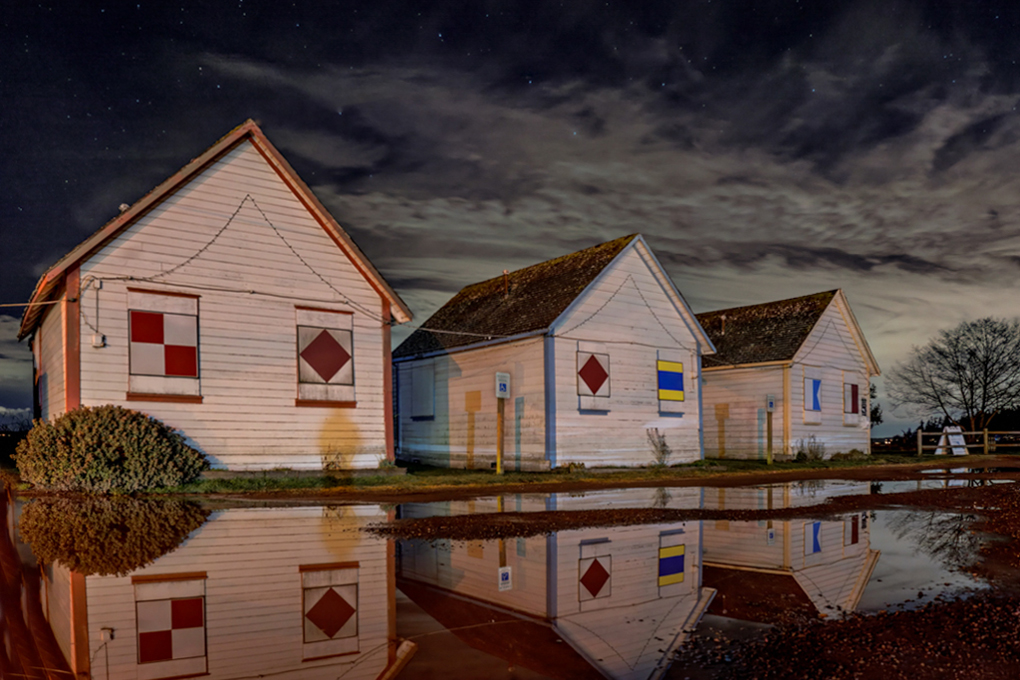 Love the three cabins and reflections. What is with the story with the code flags on the windows. UF FD AH ?? This is a beautiful image but the only thing that bothers me is the vertical convergence of the first and third houses. I tried to correct it in PS. What do you think? |