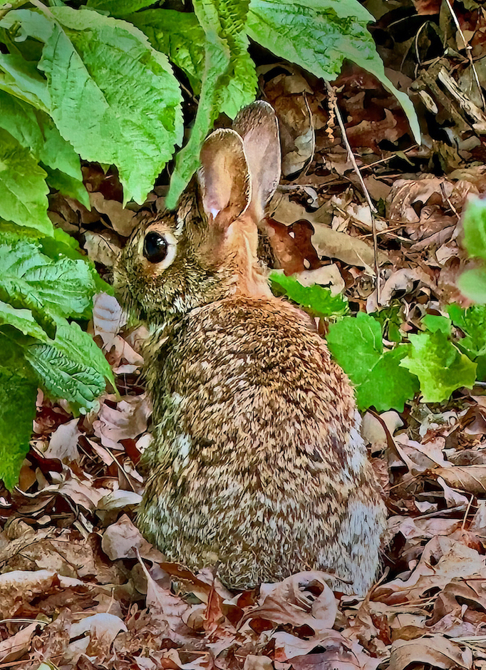Nice image of a rabbit, Jamie. Like Bev, I also adjusted contrast, burned some areas and sharpened. The only thing that really bothered me was the leaf touching and above his left ear so I cloned some detail into it. Better? |