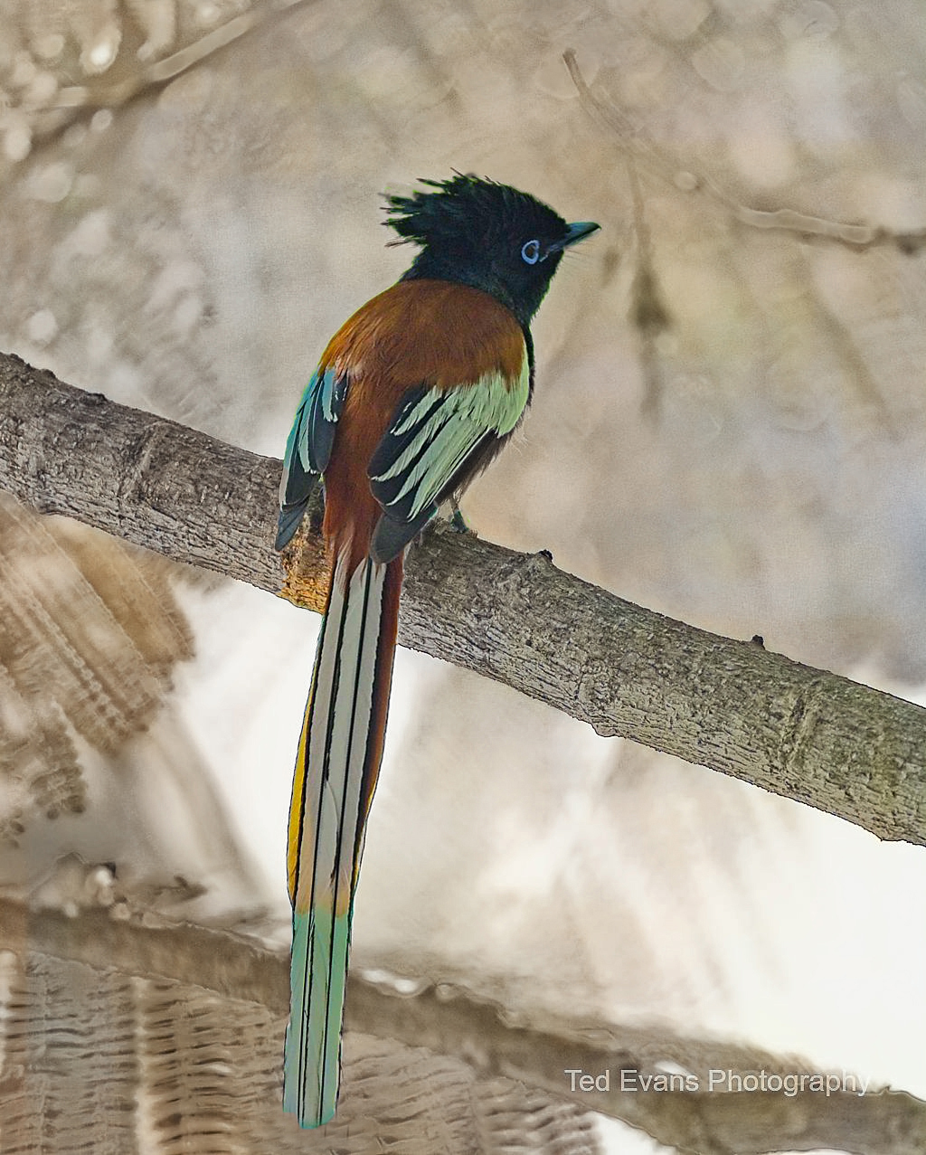 Ted, very nice catch of the African Paridise Flycatcher. Like the pose looking out into the distance. I hope you don't mind but the tail being cutoff and the pastel background just didn't feel right so I did some adjustments in PS. what do you think? |