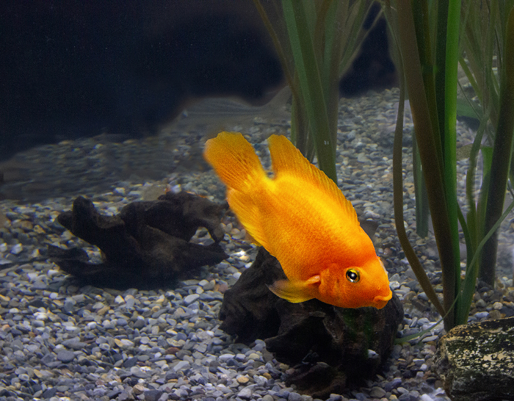 Bev, great image of a Gold Fish. I have taken many images of his in tanks and if the glass is clean they have come out very well. I hope you don't mind but I took the liberty to play with your image. I removed the pipe and several blurry fish in the background and now I think the main subject fish really pops. Let me know what you think? |