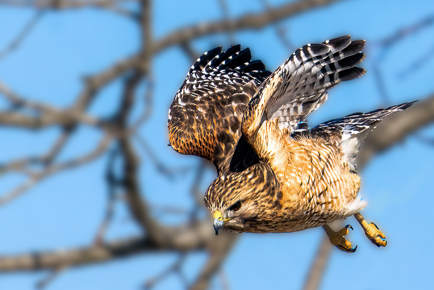 I find that the photo of the bird is ok. But at first sight, the bird is 'lost' among the branches. Unfortunately, the colour and texture of both bird and branches are more or less the same.I understand that you were matching the branch with the curve of the wings.I tried to blur the background to make the bird 'pop'. out but I don't know if that will suit you. |