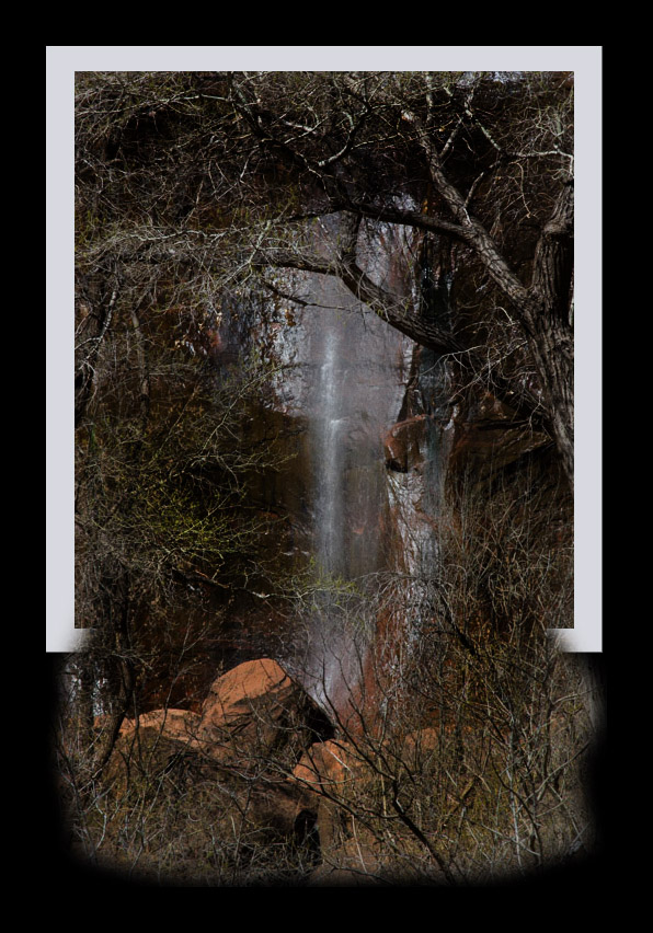 In your final, I feel the water has been highlighted to where it appears blown out to me. There is a lot in this image and I think the waterfall is kind of lost with the branches and the red rocks. |