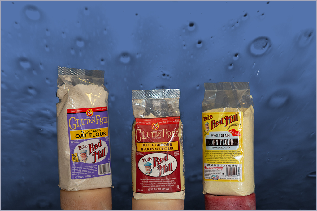 Might be able to do that with a mask and a blending mode to bring the background water over the bags but a low opacity so it doesn't cover over the bags.