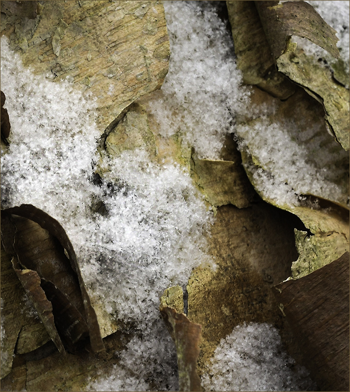 Nice macro. I love shooting bark but somehow it doesn't usually turn out as nice as this one. I'm going to take the opposite approach and say that the brightness of the snow takes my eye away from the bark. Here is my rendition done with burning in some of the snow. |