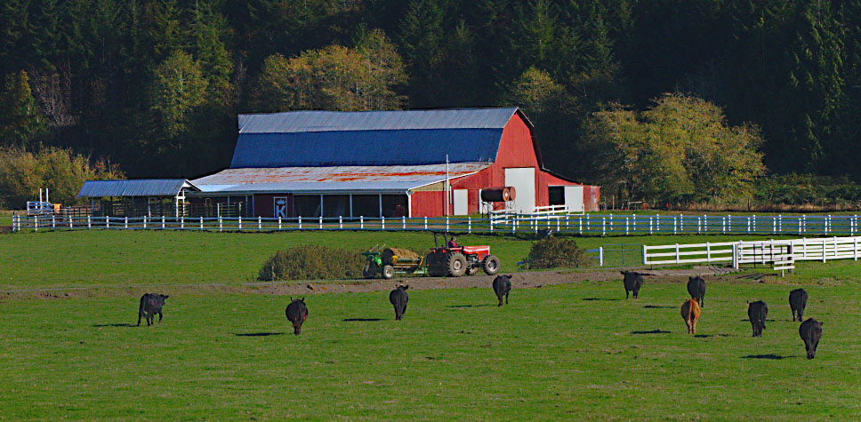 Great comments on the images. I like this scene with the red barn and the cows coming home. I felt the grass seemed a little too green. I gave it a crop and kind of intentionally centered the fence in the center putting the barn in one section and the cows in the other and also toned down the doors as suggested. I noticed the nice shadows of the cows - good lighting. Overall it's a pleasing image. Nice job! |