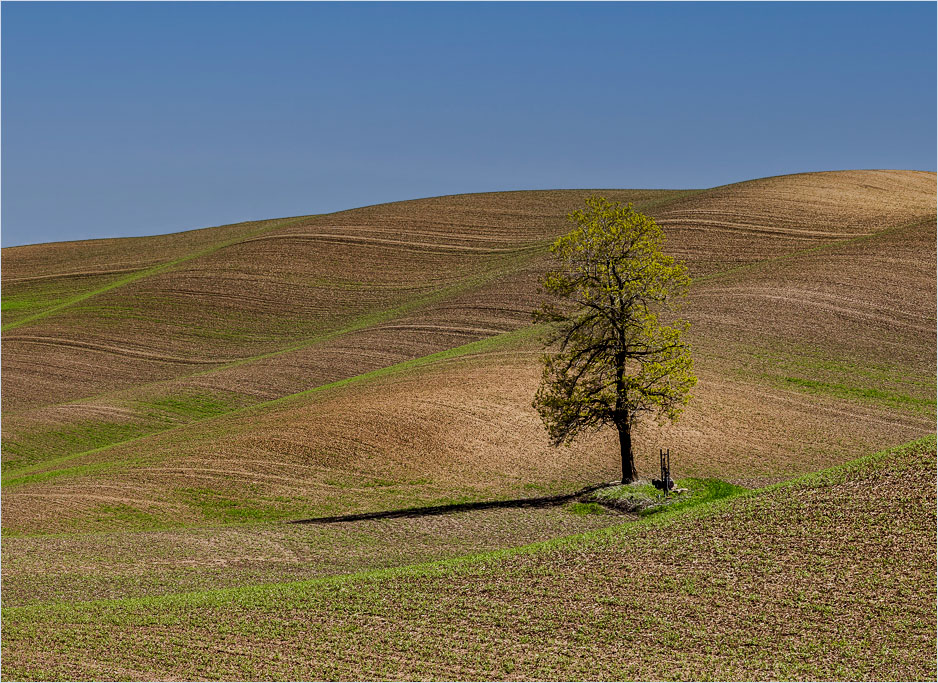 I was in the mood to play around today. I feel those clouds on the horizon draw my eye away from the tree. I also like the pump in the picture as it kind of fits the story. The well would be waiting for the rain. I didn't find it distracting. I also cropped a little off the right to make the tree a little less centered.