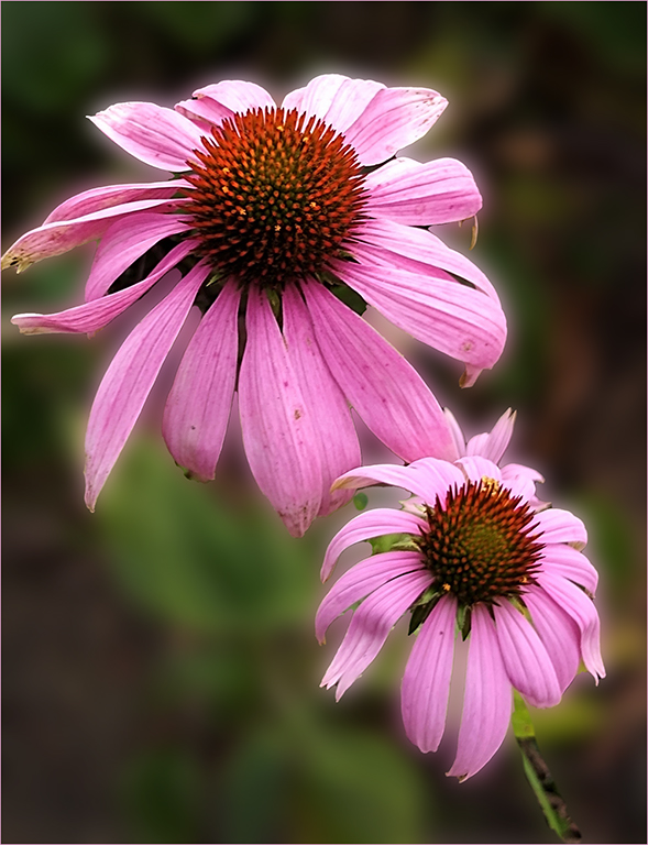 Very nice post-processing. I like the way you have accentuated the flowers with both deepening the colors and sharpening the image. To me, the bee breaks up the back and forth of the two flowers together. Great job! |