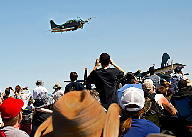 I agree with Jerry that the aircraft has captured the attention. It is difficult to get a good crowd shot and still get the aircraft as large as you want it. I tried cropping it more, burning in the hat and then increasing the size of the aircraft so it appears larger. It does get a little pixelated though and I notice the propeller has stopped. For prop aircraft, the shutter speed should be greater that 225 or so. |