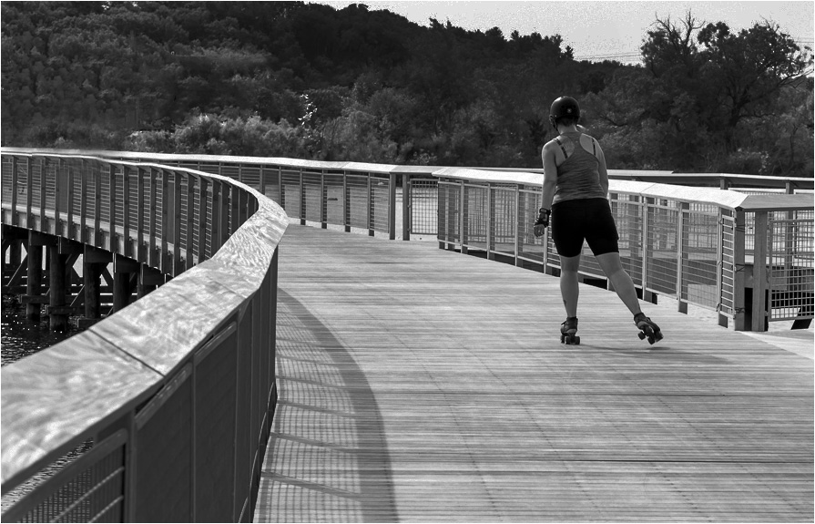 I like the conversion to black and white. As a "street photo" I think the wires don't bother me as much. I like the curve in the boardwalk. I sort of wish I could see the water on the left that is cropped out as it tells the surroundings. I tried to get rid of the wires and keep the water. I would need to spend more time on the person as she is rather dark the way I did this. |