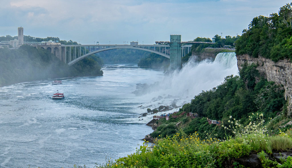 For me, there is a little too much foreground and maybe sky. I took the liberty of cropping it some to close in on the boat and the falls more. |