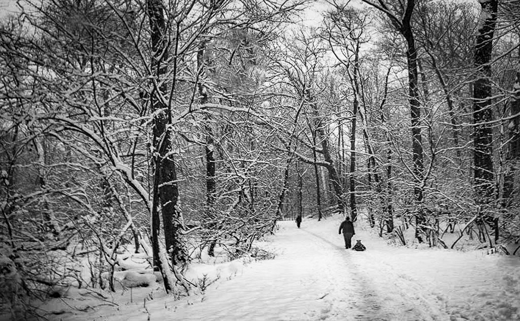 Lisa, I lived in the north for many years and did not know how to photograph snow. Now that I know more I hardly ever see snow...so lucky you. I like the story you have presented in this image. I pulled it into Silver Efex and checked the histogram; what I found it that as you have presented it there are dark and midtoness, but it is really lacking on the bright side. I applied a full dynamic range (smooth) filter then increased brightness and contrast until I shifted the histogram to the right. Then in LR I cropped from the bottom so that the dominant figure was on the lower right third power point. Lastly, I added some vignette. Take a look at my visual feedback and see what you think. |