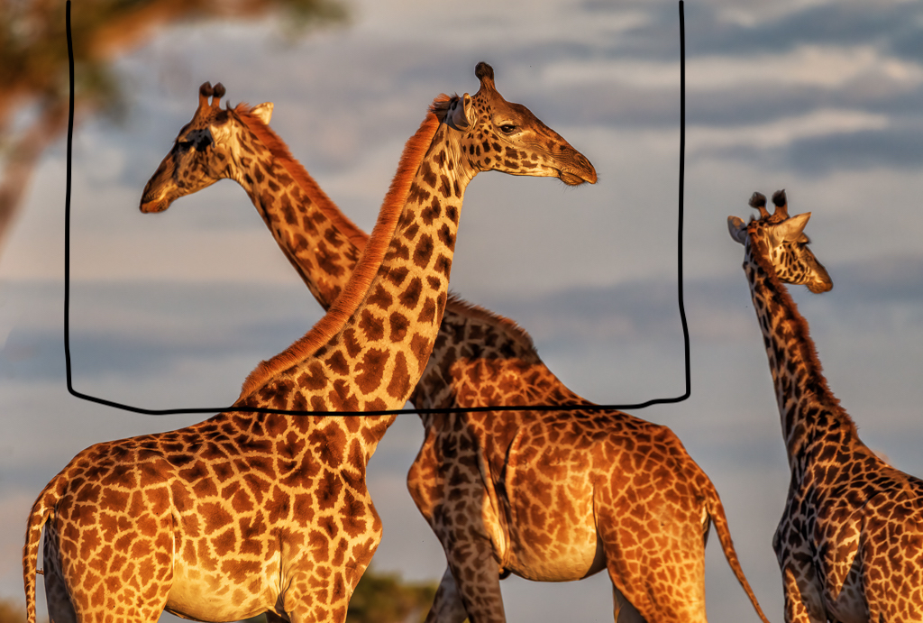 I think you captured these gnetle creatures in great light, and the backgroudn has very nice bokeh.The orange and blue color combination is beautiful in my opinion. There are some rules about photographing wildlife that I perosnally try to stick to. One of these is about cropping off parts of the subject. For me, the cropped off legs are not working. Also the giraffe on the right very close to the edge of the frame and looking in the wrong direction. I wish he was looking at the other two giraffes. After consideration I think you could make this work better by cropping as I indicated in the attached visual feedback. To me it makes the crop seem more deliberate and makes the focal point the "criss-cross" of the two giraffes' necks. My only other suggestion woudl be to brighten and sharpen the eye on fhte head on the let as Lisa has suggested. |