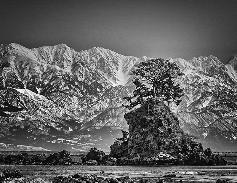 Hey Haru, first, I am a fan of your work. I am also a big fan of Black and White images and have shot, and studied them for over 50 years. As with a lot of your submitted work, I like your color versions over your black and white. It's just my opinion. This seems to hold true with this image. From a technical standpoint, I think your image is right on as usual. You asked about an emotional feeling when I looked at the image, and I have to say the splash of water did not evoke any, but the tree behide the water on the mound (not sure what to call it) against the snowy mountain really got me. I just put this together real quick to show you what I liked in this image. Of course, if the tree was a major focus I would have shot it from another angle against the mountain. Not sure what to do about the sky. |