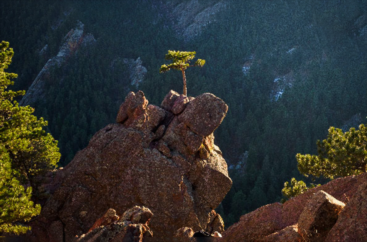 Quang you must keep fit. The warmth of the colour in the rock brings it very close and the blue hue in the trees in the background push it away so the depth aspect is enhanced by the colours. Depth is also achieved by the sharpness in the foreground and blurriness of the background. The top of the focal tree feels to close to the top of the image, it needs more air, and the branches top right could be a distraction. In the suggested attachment i've added some height above the tree, removed the branches, reduce the hotspots on the rocks and applied a light vignette to pull the focus back to the tree. |