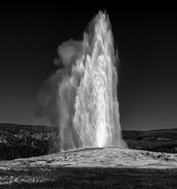 The definition in the water stands out more in the B&W. I can even see individual drops on the right side that I can see well in the color. Good contrast and lots of detail in the geyser. There is a lot to work with here and I think you can keep the aspect ration but bring in the sides and the bottom some to give the geyser more emphasis. I lowered the highlights, raised the whites and lowered the blacks then raised the texture and clarity. I think it brings out more detail in the geyser. See what you think. All done in Lightroom. |