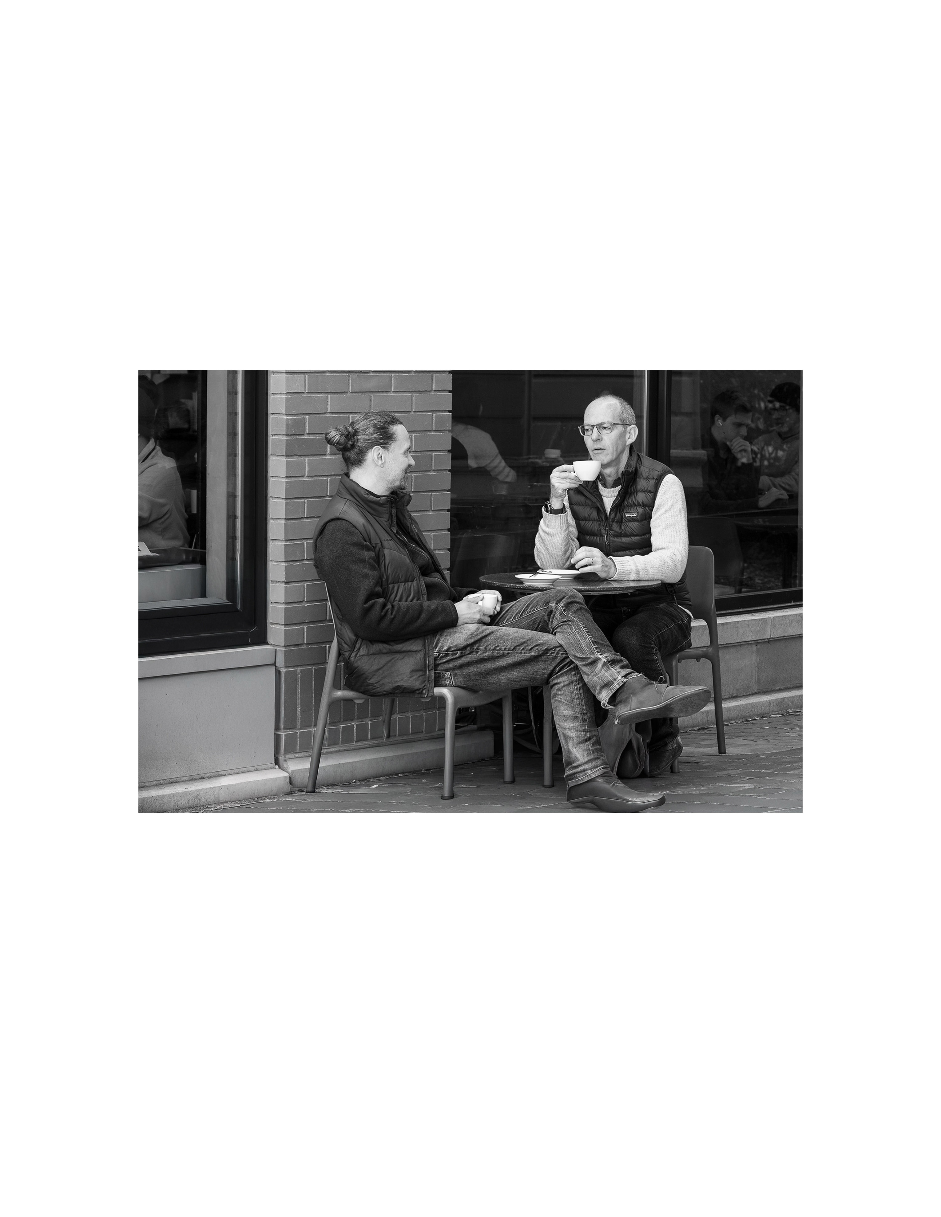 The interaction between the two men makes this image one that each viewer can develope thier own story from, expecially the man on the right. I can imagine him saying, "you can't be serious" or "your kidding". It is a good catch with interest and impact and would look artistic framed with a big white matt.