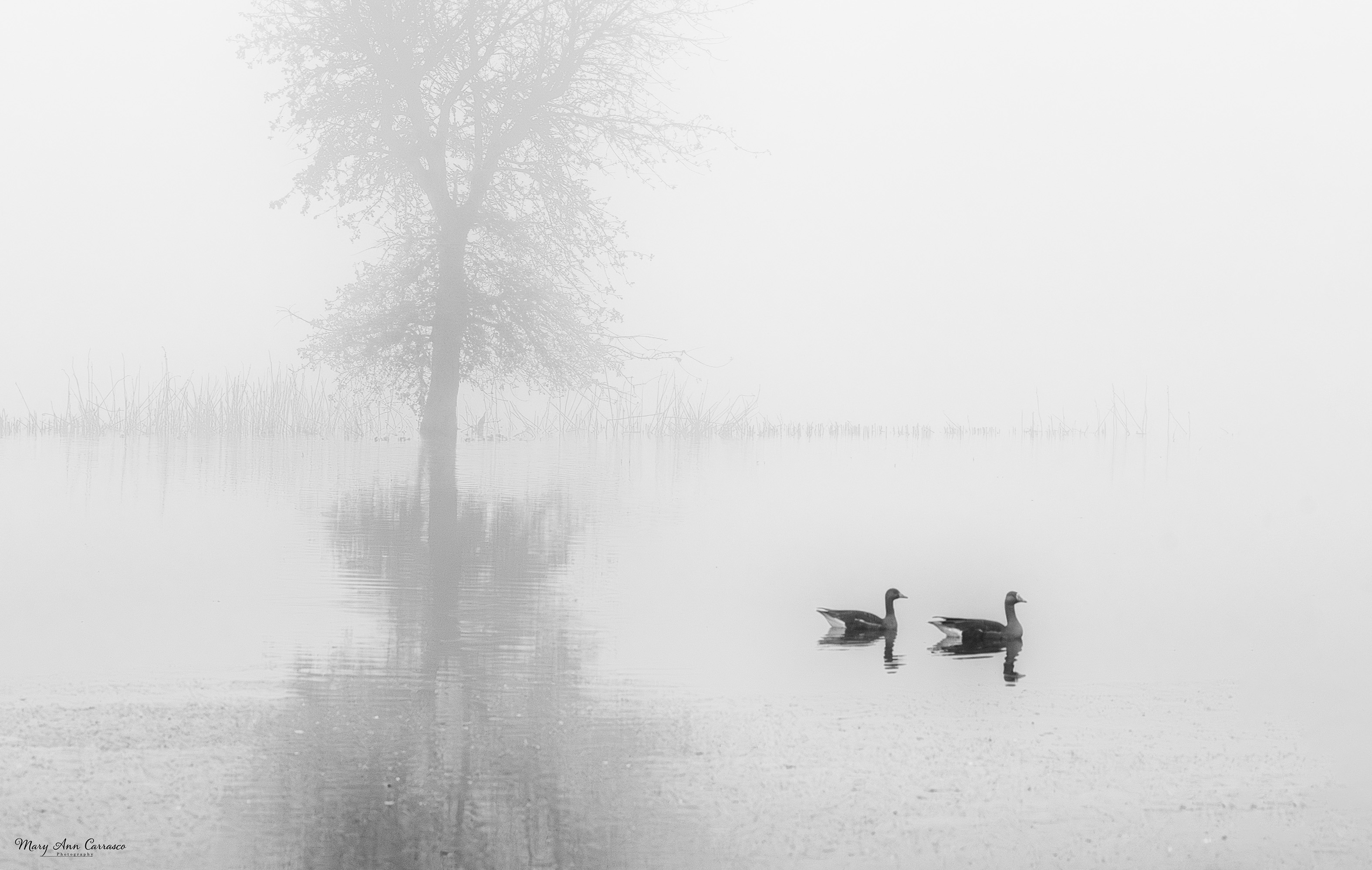 A great effect created by the fog. The ducks and reflections of the ducks in the water is a strong visual. High impact and interest.
