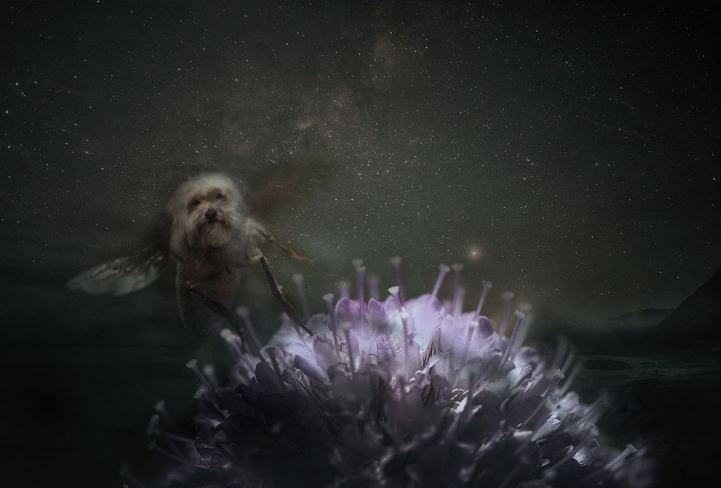 The bee is a good element and the idea of changing the face for the dog's can work but you have to look closely and see where the sharpness begins and ends to make a good fusion of the elements and achieve the optimal results.