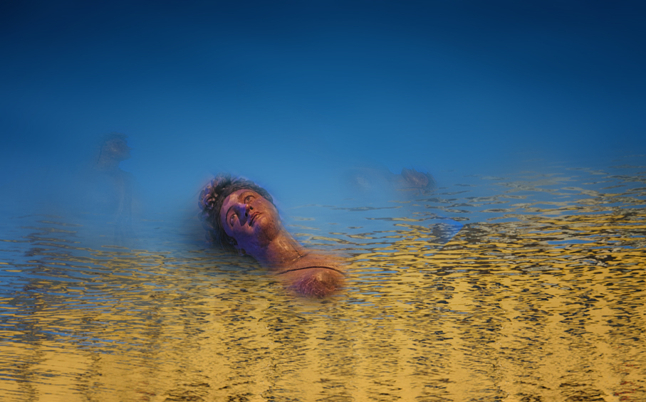 You have created an image where you want show the determination and the yearning of the Mermaid, quite difficult to get it. I agree with Peggy, as you flipped the layer of the water it looks a little unnatural, and for me the other weak point is the two other mermaids,I don't get the feeling that they are underwater maybe is for the position of them.