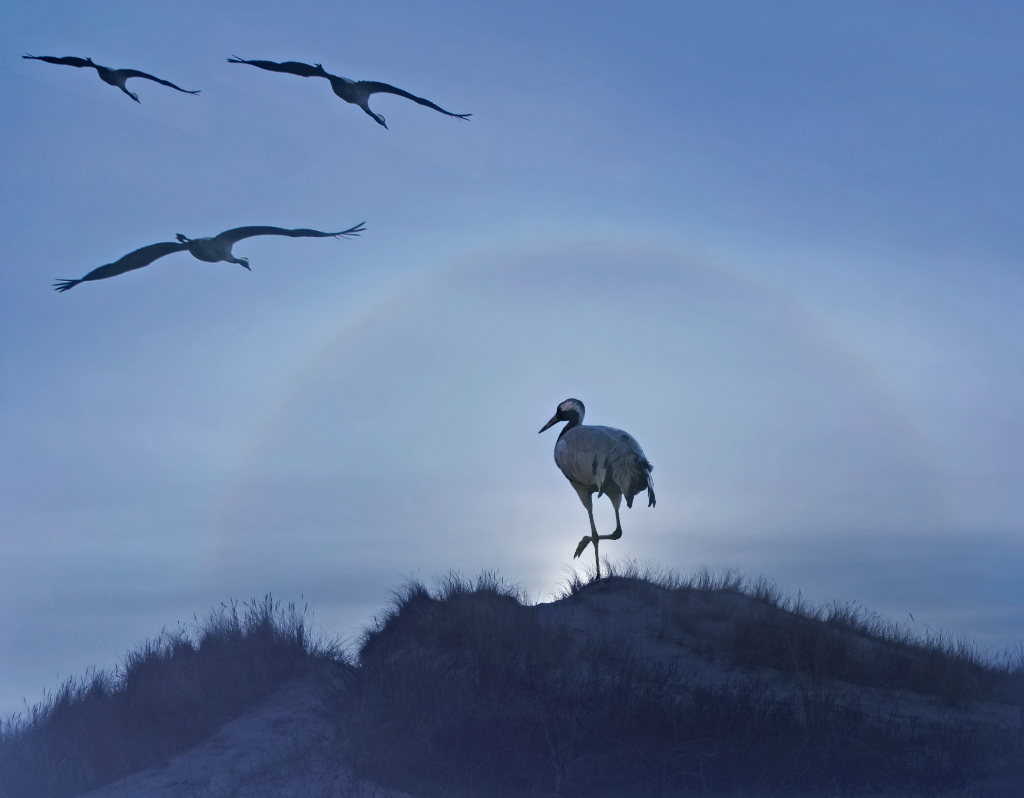 What a lovely scene with the crane surrounded by this halo and the feeling of haze in the early morning. I've been exploring different cropping options and compositions and I have to say that maybe the last one is the one that I like most. I find that the composition and story are more complete. I like the feeling of early morning that you have achieved in the image, but considering that the light is coming from the front, I would suggest lowering the light a little on the dune as it should be a darken area due the light coming from the other side.