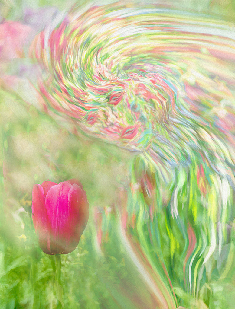 You've captured a beautiful spring spirit in this image! The colours evoke the feeling of spring, and the fine lines of the face stand out nicely. I like the positioning of the spirit looking at the flower; however, I would suggest making the spirit more prominent than the flower to better convey the grandeur of spring spreading across the flower field.