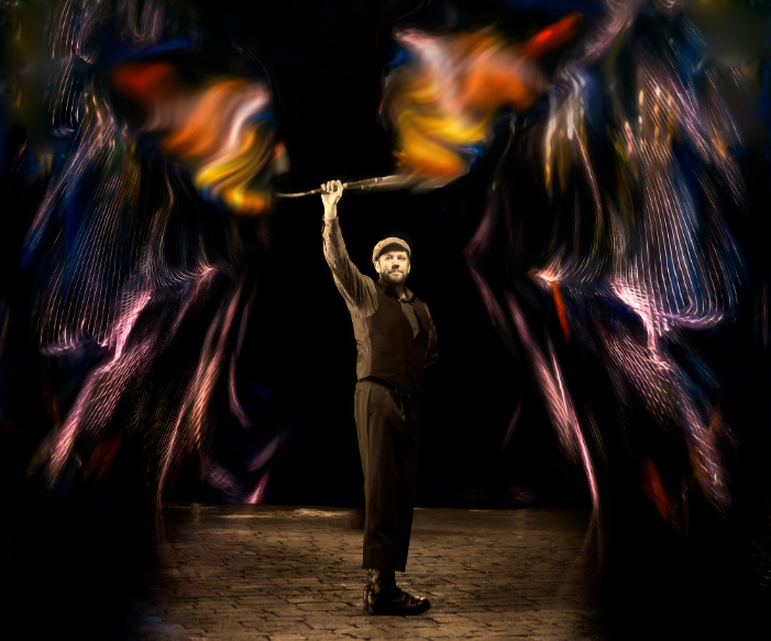 You mentioned having trouble with the flames, so I took the liberty of experimenting a bit. I selected one of the colourful areas and used it to replace the flames, applying some transform tools, motion blur, and liquify to blend it in. To reduce visual competition, I also cropped the image slightly, keeping the illusionist as the clear main character in the scene.